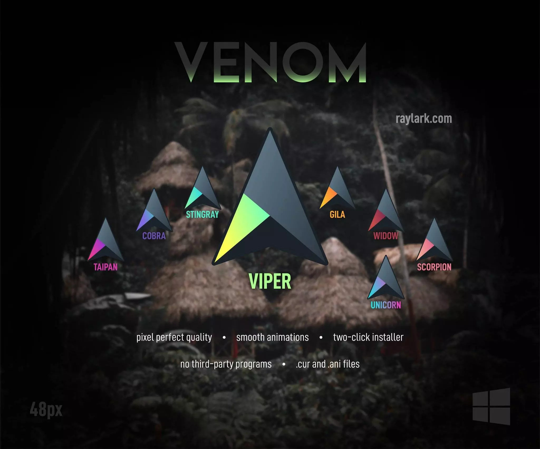 From all the cursor styles that we’ve seen, Venom is arguably the favorite one for all my gamer friends. It comes both with gray and colored paints, and you’ll find 8 mouse pointers in total to choose from. All pointers have been designed in the form of triangles, and the left corner of which is highlighted with a mottled shade.