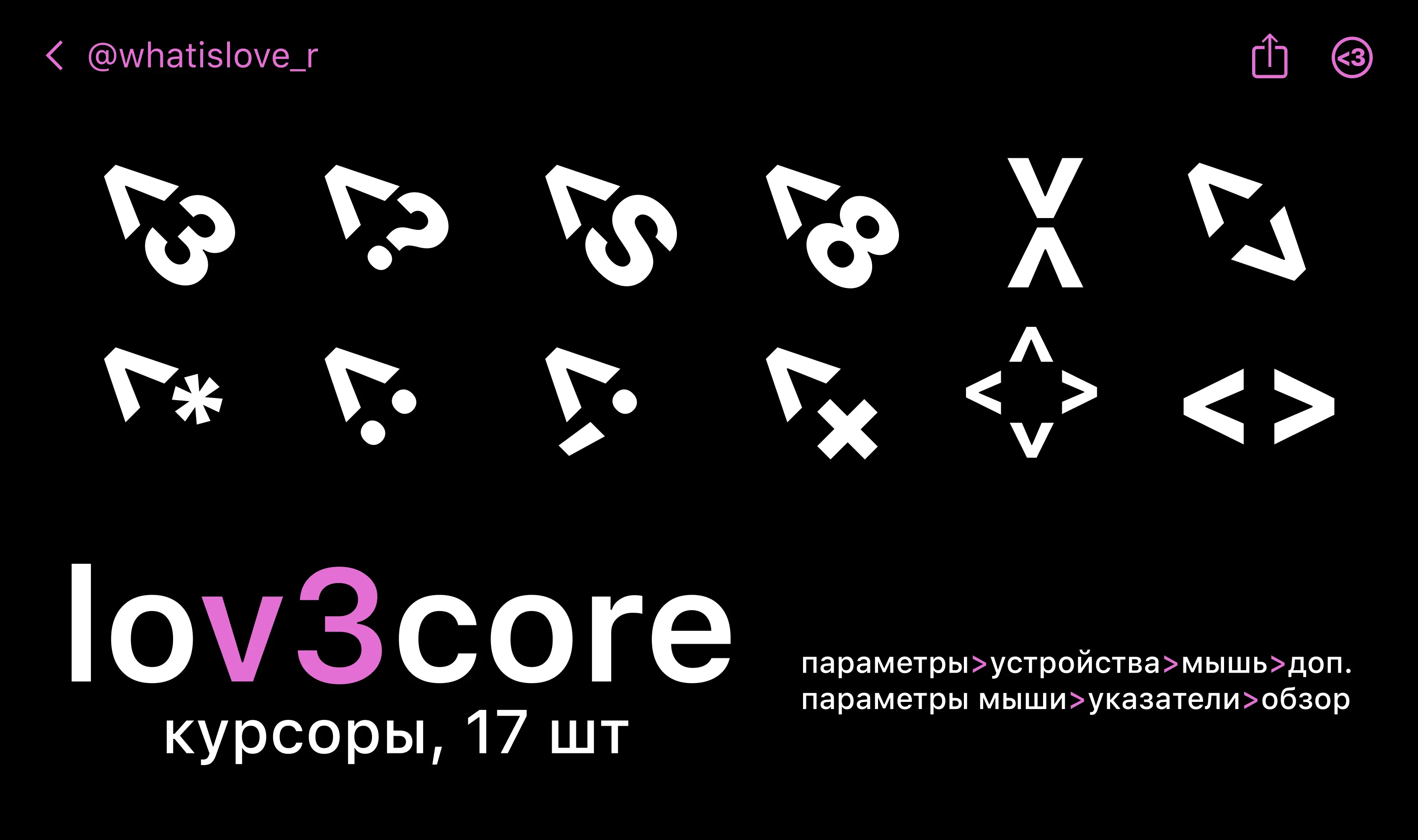 The Lov3core cursor set is a static Windows pointer pack made up of 17 custom cursors designed in a unified love-themed style for all the basic mouse pointer states (like the regular arrow, link click, text select, etc.). Each cursor in the set has been carefully crafted to fit a cohesive aesthetic, so when you install the entire set, your desktop feels visually consistent and themed, rather than a mix of random designs.